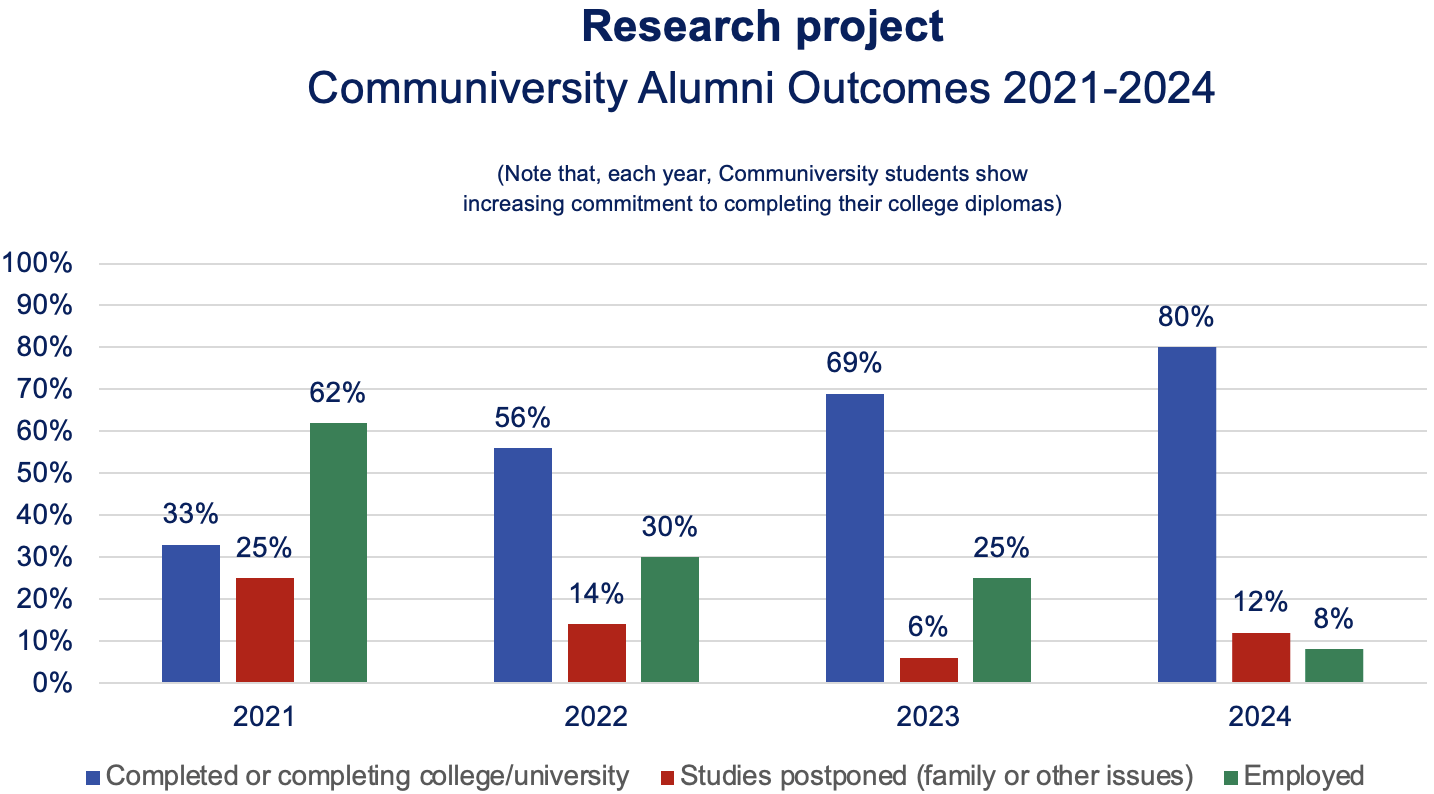 Most non-profit organizations list their achievements as accomplishments that end with their goals being reached. The Communiversity did the same over the years but then, with growing curiosity, we began to look beyond the end goal of college placement and entry or employment or other training for each of our graduates—and started a Phase Two of our research project to find out what happened after our alumni left us and after they were placed. That data has been collected and can be currently summarized as follows: